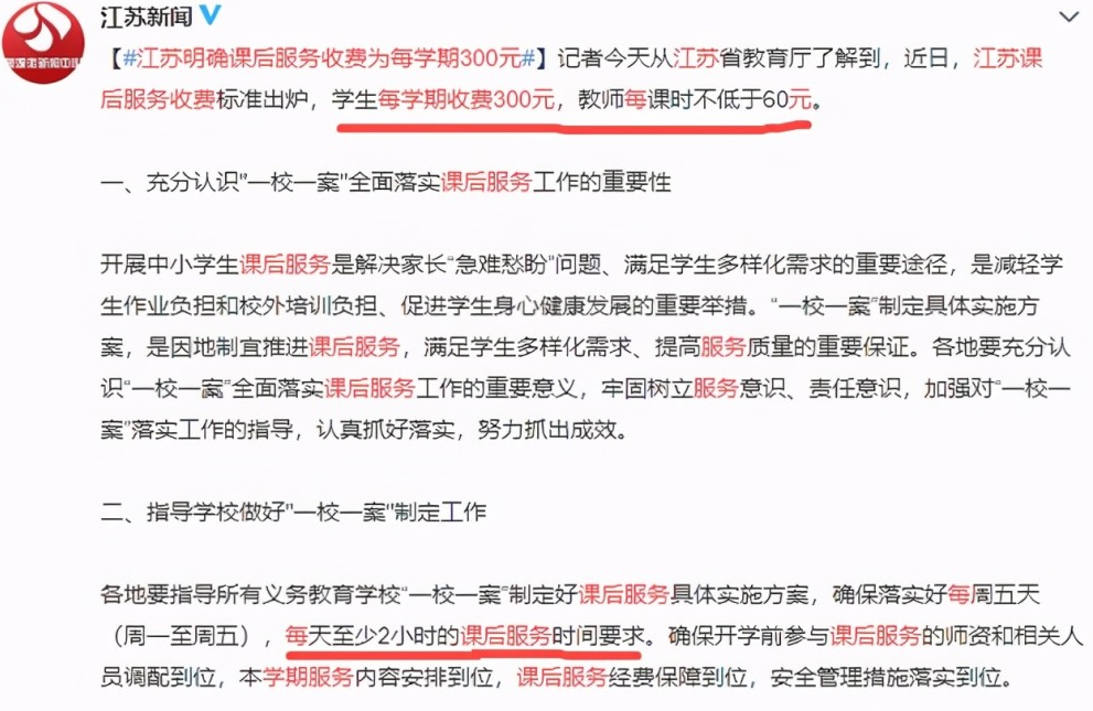 江苏省要求给老师的课后服务补助,不能低于每小时60元,如果按一天服务两个小时来算,一天就是补助120元,一个月下来也有不少了。