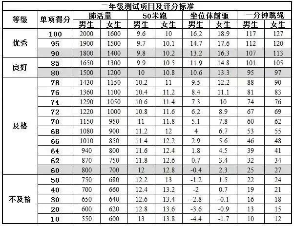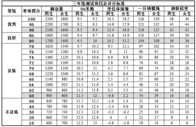 增强青少年体质,让“小眼镜”“小胖墩”越来越少,如今的小学生体育达标的国家标准也已经改变,体育项目上减除了立定跳远;一、二年级包含50米跑、坐位体前屈、1分钟跳绳;三年级开始增加1分钟仰卧起坐;五年级再次增加50米*8往返跑。