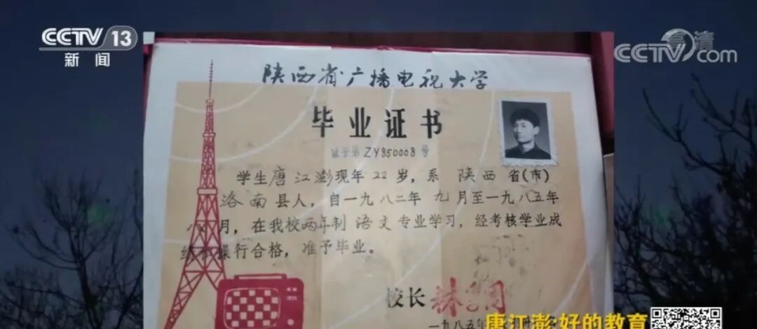 三年时间,唐江澎自学了电大的课程,取得了中文大专的学历。后来,他又用两年的时间到陕西教育学院进修,获得了中文本科的学历。