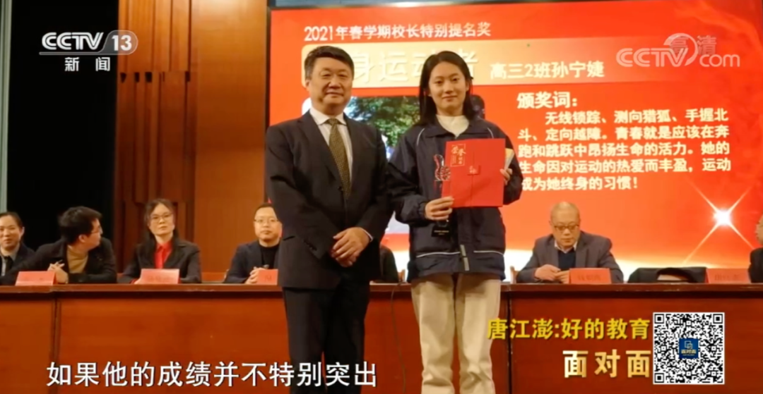 唐江澎为天天坚持跑步的同学发奖,即使他的成绩并不是特别突出。唐江澎为天天给父母打电话的孩子发孝心奖,他说父母培养一个让自己暖心的孩子,这是挺成功的事。