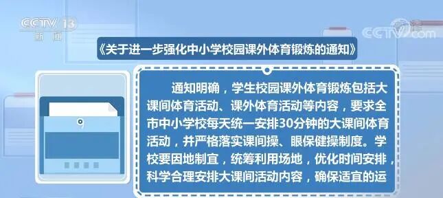 通知明确,学生校园课外体育锻炼包括大课间体育活动、课外体育活动等内容,要求全市中小学校每天统一安排30分钟的大课间体育活动,并严格落实课间操、眼保健操制度。学校要因地制宜,统筹利用场地,优化时间安排,科学合理安排大课间活动内容,确保适宜的运动负荷,达到锻炼身心的目的。同时,利用好课间十分钟鼓励学生“走出来”到室外活动,放松身心、缓解疲劳。