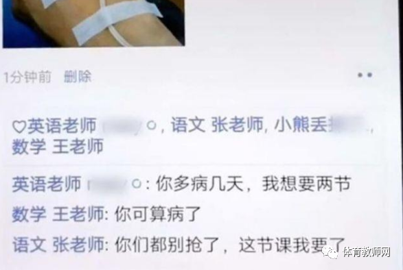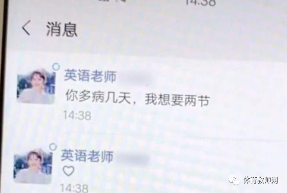 让原本和各科老师都有良好关系的体育老师瞬间有些心寒,没想到自己请假大家关心的不是自己的身体而是空出来的课,而这段记录被小刘发布到了网上后也让很多网友感到心酸的同时,有感到一丝好笑。可见现在的老师想要占体育课就只能等到体育老师生病了。