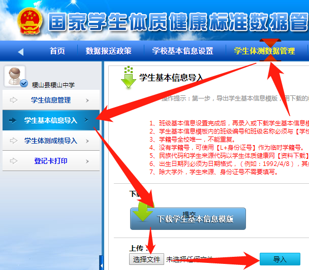 学生基本信息导入和年级班级信息导入一样建议通过“班级数据导入”,通过班级模版填写数据。学生基本信息包括:班级编号、班级名称、学籍号、民族代码、姓名、性别、出生日期、学生来源、身份证号、家庭住址 10项组成。