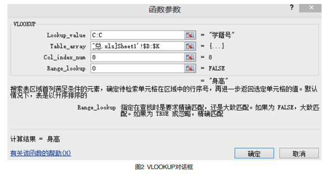 首先打开表1体质测试成绩导入模板,然后打开之前整理好的所有学生体质测试的成绩,现在需要把体测成绩匹配到模板中。以身高一列为例,身高在表1的K列,鼠标点击K2然后点击公式,在点击插入公式,在弹出的对话框中找“VL00KUP”选中点击确定,会弹出下面一个对话框,如图2。由于学生的名字存在重名的情况,建议用学籍号作 为匹配的依据,选中表1的学籍号列就会出现“C:C”,在 表二里从学籍列拖到身高列就会出现“$D: $K,8”的意思是“$D: $K”共有多少列。最后一行就写0,点击确定K2 就出现一个身高数字,身高就从表2匹配过来了。鼠标放 在K2单元格的右下角让其出现一个黑色的“+”,往下拖填充公式,然后复制选择性粘贴在弹出的对话框点数值,身高就从表2匹配过来了。
