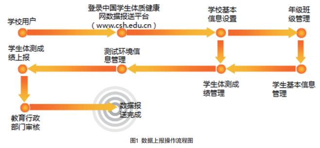 数据上报的流程为中国学生体质健康网数据报送平台的登录、学校基本信息的设置、年级班级管理、学生基本信息管理、学生体侧成绩管理、测试环境信息管理、学生体侧成绩上报、教育行政部门审核、数据报送完成等,具体如图1。
