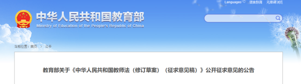 教育部网站11月29日消息,教育部发布公告,就《中华人民共和国教师法(修订草案)(征求意见稿)》(下称《征求意见稿》)公开征求意见,意见反馈截止时间为2021年12月20日。