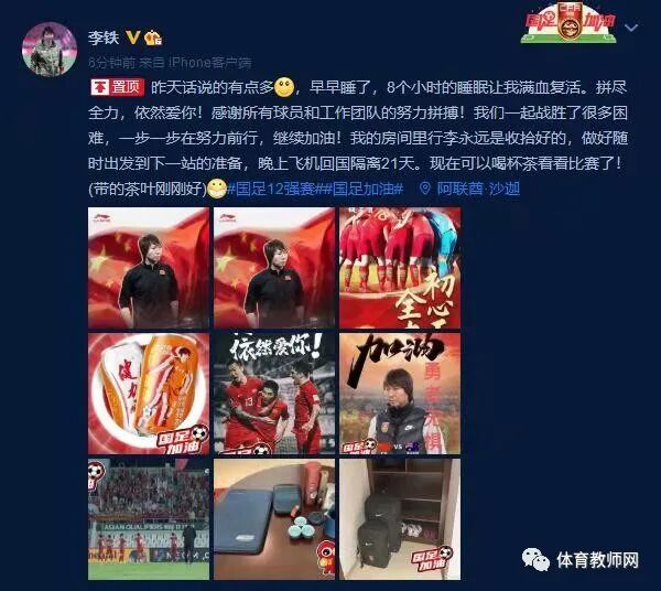 与澳大利亚平手之后,李铁马上更新微博,看似在替中国加油助威,但是图片里面带有两个品牌的宣传,被质疑带货之后,被迫删掉了图片。是否暗中带货,我们也不清楚。换人的不合理让球迷们实在难过,赛后及时的更新又让人感到失望。我想还是太年轻吧,足球需要沉淀。