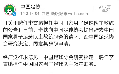 经广泛征求意见,中国足球协会研究决定,聘任李霄鹏担任中国国家男子足球队主教练职务。