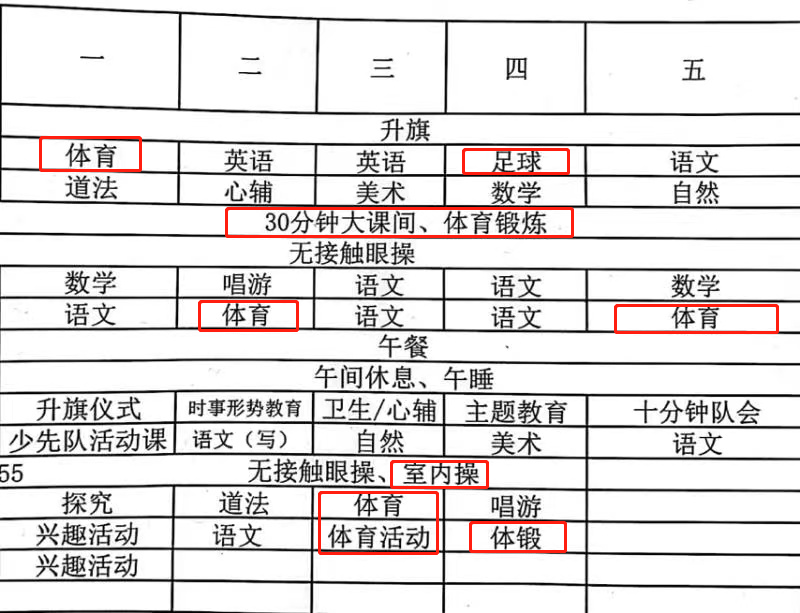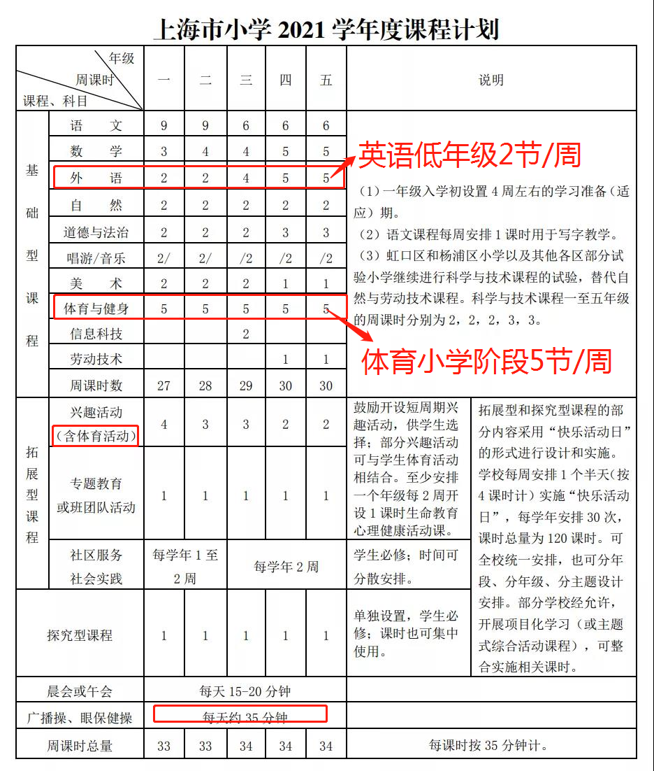 在今年上海市教委印发《上海市中小学2021学年度课程计划及其说明》的通知中进一步明确了。体育课的课时安排,英语调整为2节每周,体育课却要求每天一节。