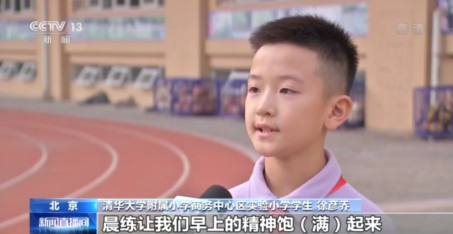 清华大学附属小学商务中心区实验小学学生 徐彦乔:晨练让我们早上的精神饱满起来,晚练我参加了足球社团,让我结交更多的朋友。