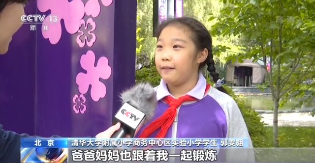 清华大学附属小学商务中心区实验小学学生 郭雯翾:这学期我通过学校组织的运动,瘦了五六斤,现在爸爸妈妈也跟着我一起锻炼,他们也瘦了一些。
