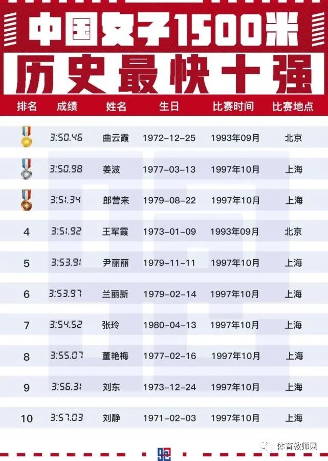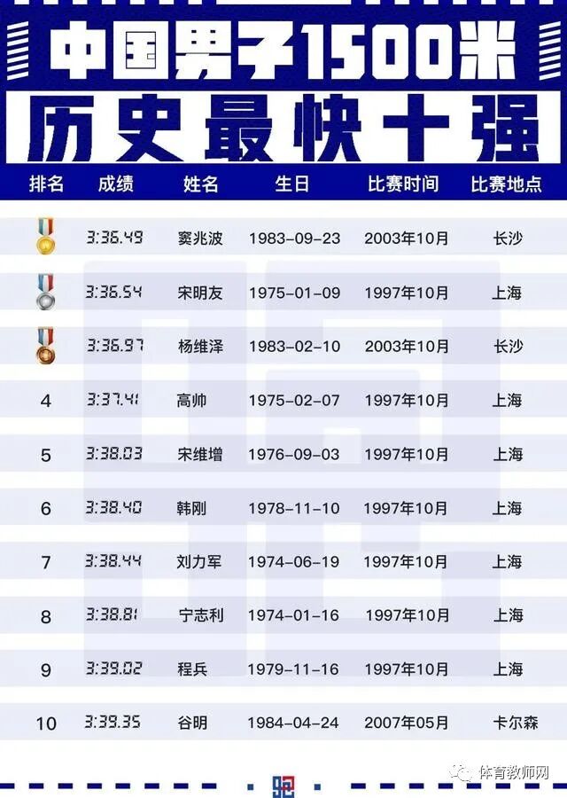2003年在长沙窦兆波跑出了3分36秒49,打破了尘封已久的全国记录,并保持至今。中国女子1500米记录由曲云霞1993年在北京创造,成绩为3分50秒46