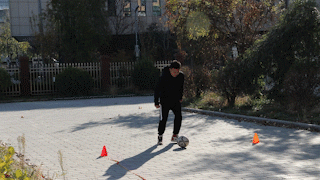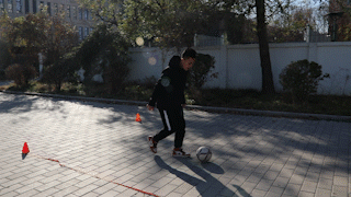 纠正方法:运球时身体重心过高,导致控制不住足球滚动的速度,运球经常性失误与不稳。正确方法是->第一个障碍用右脚脚弓将球推向靠近第二个障碍左侧,身体随即跟上,以此类推,变向时注意降低身体重心。