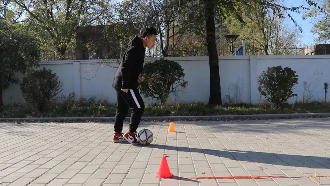 适用于喜欢使用惯用脚的学生们。以惯用右脚的同学为例:当球在右侧时,用脚内侧触球;当球在左侧时,以外脚背触球。