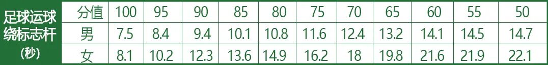 每位考生需依次S形绕过标志杆(左右均可);运球过程中,若考生暂时失去对球的控制,但球未出测试区域,考生可自行运球返回继续绕杆,此过程秒表不停。以十分之一秒为单位记录测试成绩,过百分之一秒进位。如:7.11为7.2。