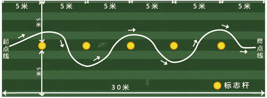 在平整的人工草或天然草足球场上,测试区域长30米,宽10米,起点线至第一杆距离为5米,各杆间距5米,共设5根标志杆(高度不低于1.2米),标杆距两侧边线各5米。
