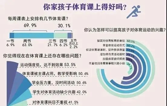 调查中,60.5%的受访家长认为要提高对体育教育的重视,60.2%的受访家长建议丰富体育运动形式,51.9%的受访家长认为要保证体育课课时,提升教学质量。其他建议还有:增加体育课活动器材(44.5%),加强体育教师师资(44.0%),丰富校园体育赛事和兴趣小组(34.7%),改变体育教育唯分数论(27.7%)等。