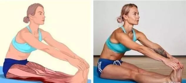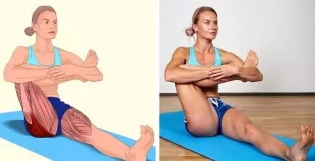要点:坐在地板上,双腿伸直打开,不要弯曲膝盖,身体向前倾斜,双手沿着双腿向前伸展。