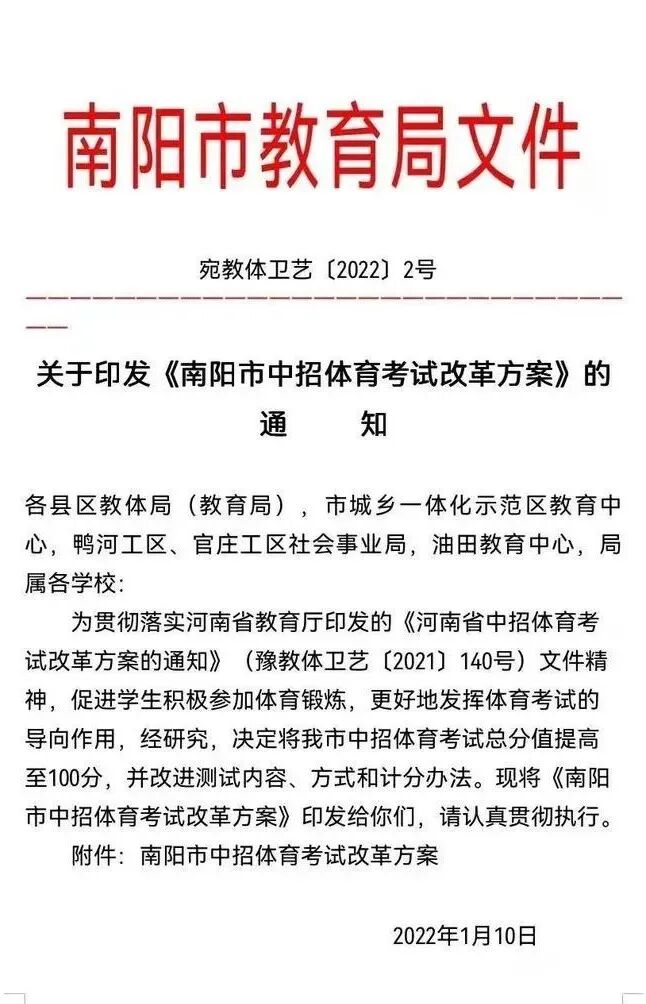 1月10日,南阳市印发《南阳市中招体育考试改革方案》,将体育考试总分值提高至100分,并改进测试内容、方式和计分办法。