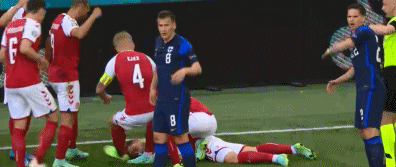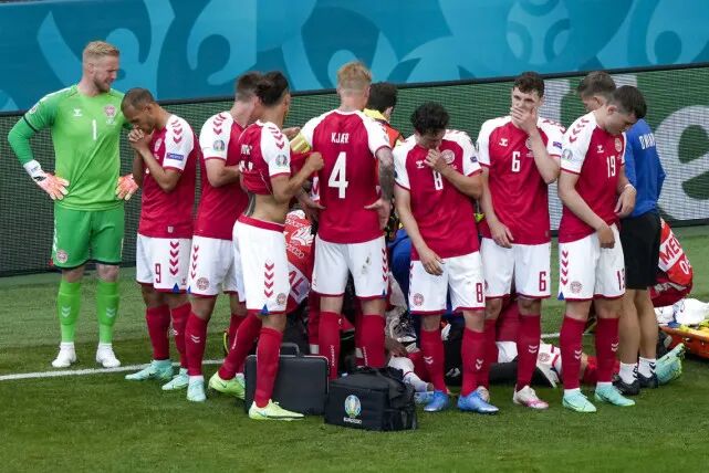 在丹麦对阵芬兰的比赛中,第42分钟,丹麦队中场核心埃里克森在无球员接触的情况下,突然倒地。比赛一度暂停。