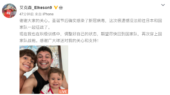 北京时间1月21日,目前身在国外的中国男足球员艾克森发文称自己圣诞节后感染新冠,确定无缘前往日本和国家队一起征战。