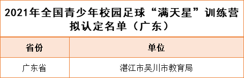 其中,广东有1个单位入选2021年全国青少年校园足球“满天星”训练营拟认定名单,有3个单位入选2021年全国青少年校园足球试点县(区)拟认定名单,有267所学校入选2021年全国青少年校园足球特色学校拟认定名单,有183家幼儿园入选2021年度全国足球特色幼儿园拟认定名单。