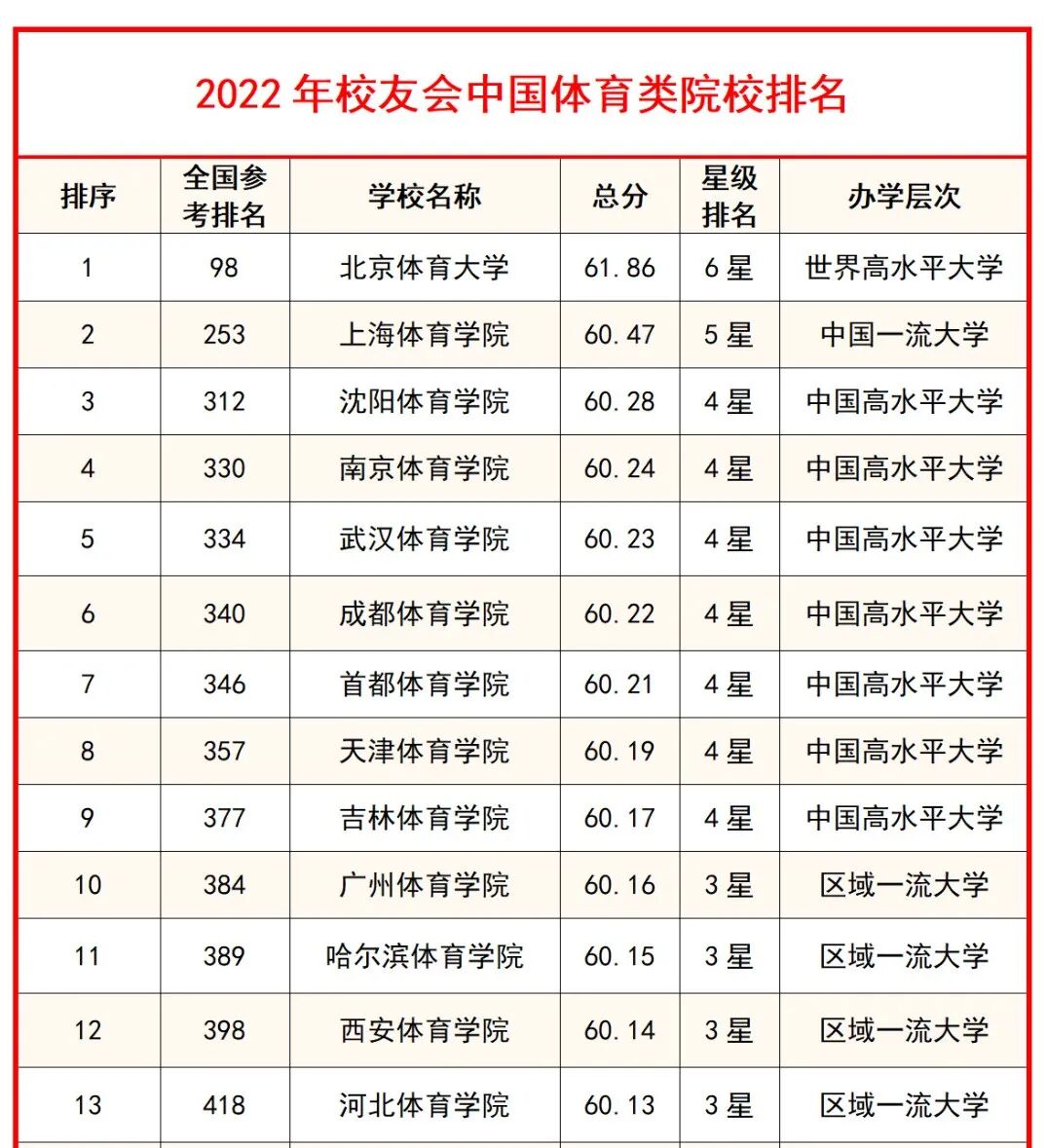 在最新2022中国大学分类排名中,北京体育大学名列体育类大学排名第一,上海体育学院位居第二,沈阳体育学院进入前三。具体如下:
