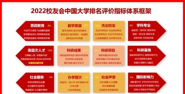 2022校友会中国大学排名评价指标体系由思政教育、杰出校友、教学质量、高层次人才、优势学科专业、科研成果、科研基地、科研项目、社会服务、办学层次、社会声誉、国际影响力等12大一级指标构成,以服务国家“双一流”发展战略和提升高校服务国家地方经济社会发展能力为导向,涵盖了中国高校核心职能的700多项评测指标。