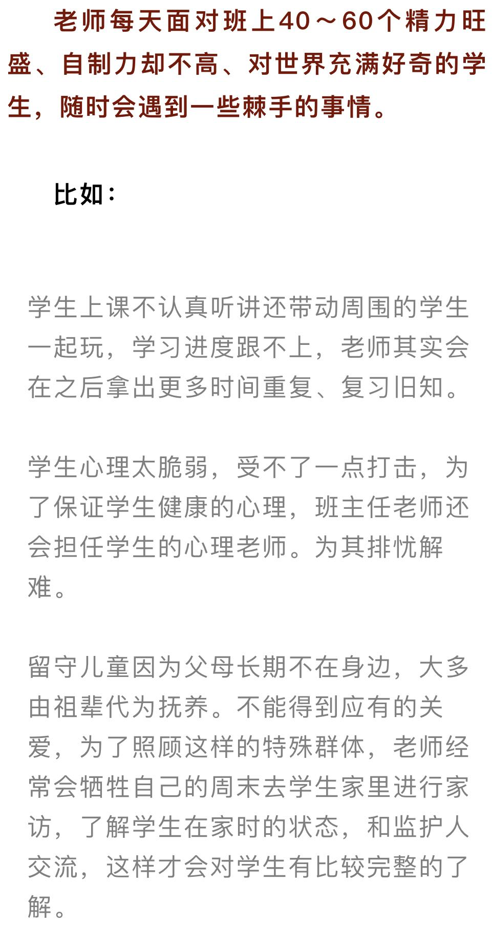 另一方面很多过分溺爱自己孩子的家长把孩子送到学校,不准老师进行批评教育,更有甚者以孩子年龄尚小,避免影响孩子骨骼发育为由不让孩子写作业?看见自己孩子没有别人家孩子优秀又反过来指责老师教的不好。