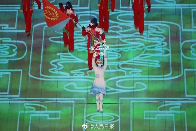 运动场上,现场引导员手中的引导牌是一朵“雪花”,据@央视新闻,雪花的“花瓣”融入了“中国结”的设计元素,每个代表团就象征着奥林匹克大家庭的一片小雪花。
