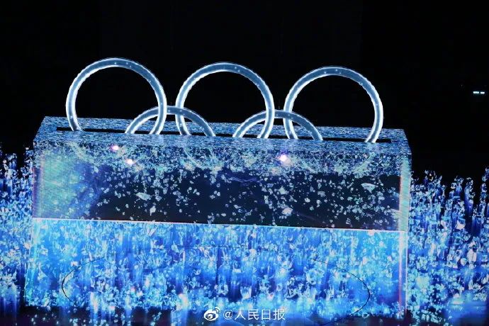 而当无数冰球撞向它,看似坚韧的“冰立方”逐渐破碎、流动了起来,晶莹剔透的冰雪五环“破冰”而出。