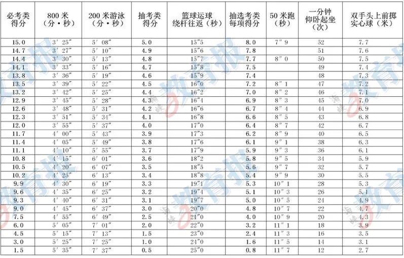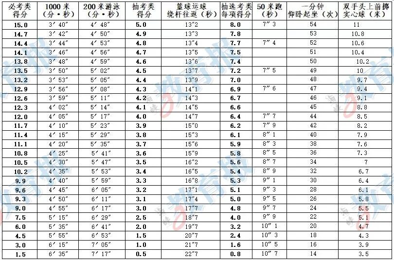 1、必考类:1000米跑(男)、800米跑(女)或200米游泳(泳姿不限),考生按性别从2个选项中自选1项考试。