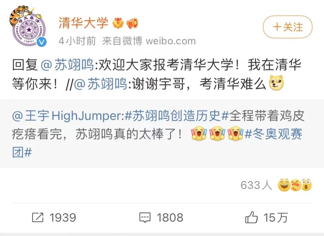 22日凌晨,@苏翊鸣 在微博下回复网友祝福,其中在回复清华大学学生、跳高运动员王宇的微博时询问:考清华难吗?