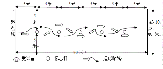 考生站在起点线后准备,当听到出发口令后开始向前运球依次过杆,考生和球均越过终点线即为结束;发令员发令后开始计时,考生与球均到达终点线时停表(运球路线见上图)。每人测试两次,取最好成绩作为该项测试最终成绩。每位考生需依次S形绕过标志杆(左右均可);运球过程中,若考生暂时失去对球的控制,但球未出测试区域,考生可自行运球返回继续绕杆,此过程秒表不停。以十分之一秒为单位记录测试成绩,过百分之一秒进位。如:7.11为7.2。