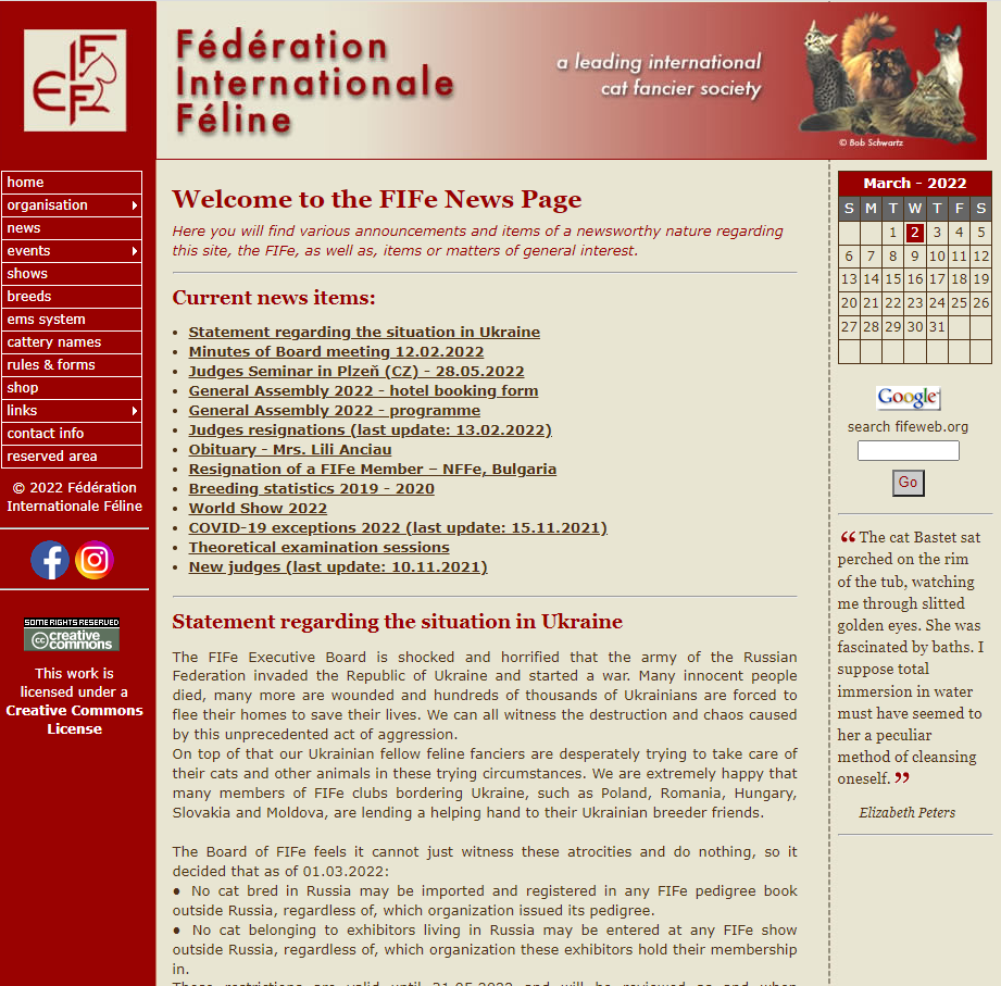 3月1日,猫科动物国际联合会(FIFe)在官网和社交媒体账号等渠道同步发表“就乌克兰局势声明”,宣布董事会对于“俄罗斯入侵乌克兰致使许多无辜平民死亡、数十万人流离失所”表示震惊。