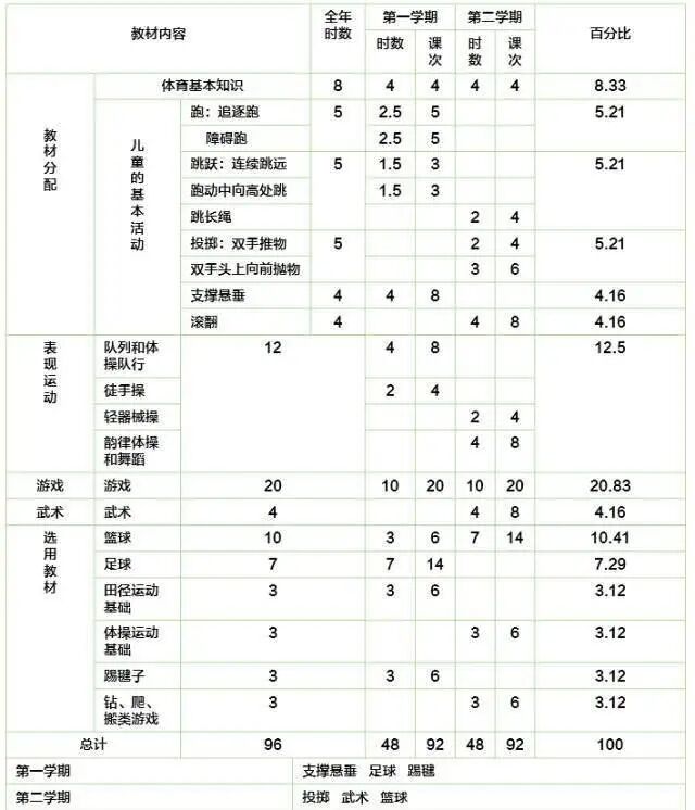 (2)根据北京市义务教育课程改革《体育与健康》教材时数比重的规定(还可自行调整),计算并确定各类教材的教学时数、课次(指双教材),填写全年教学计划表格 。