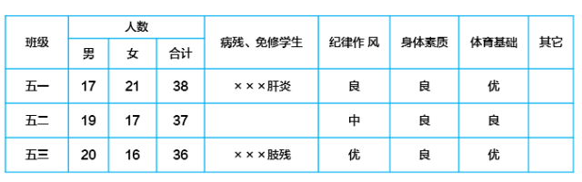 (3)做好调查研究工作, 全面了解学生对体育的兴趣、爱好、特长、身体素质、健康状况身体活动的能力及对体育与健康基本知识、基本技术、基本技能掌握的情况等,并加以分析,从而使教师心中有数, 做到计划安排有的放矢,切实可行;
