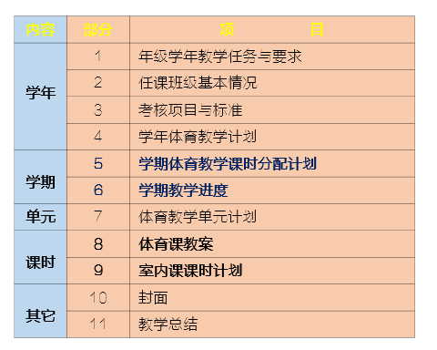 课时计划的形式可以多样化(表格式、笔记式、卡片式等),但 应包括教学目标、教学内容、教与学的方法、教学的组织、教学评价、教学后记、运动负荷及练习密度的预计等。