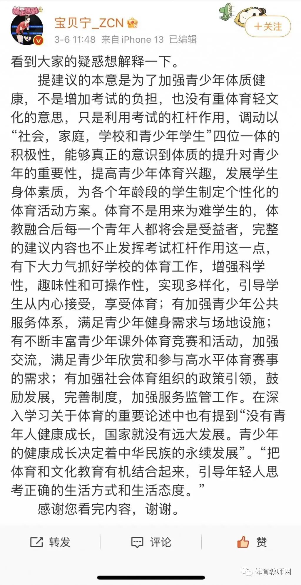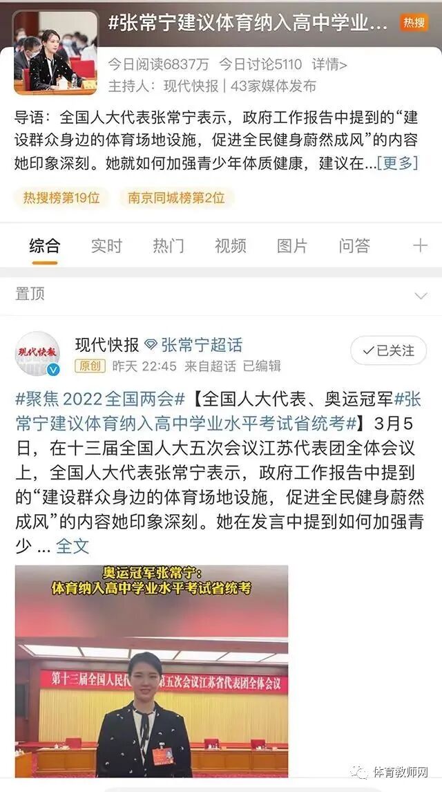 3 月 5 日,全国人大代表、江苏省体育局训练中心女子排球队队长张常宁在接受现代快报记者采访时表示,今年十分关注青少年体质健康问题。相关 " 张常宁建议体育纳入高中学业水平考试省统考 " 话题登上热搜,引发网友们热议。3 月 6 日,张常宁通过微博 @宝贝宁 _ZCN 作出回应,再次详述自己对青少年体育的关注,以及提此建议的初衷。