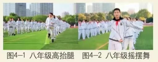 选用节奏明快的音乐,剪 辑成4 m i n左右带有口令和节拍的“一首歌”,随着音乐的节奏让学生完成热身活动。练习内容包括肩部激活、扩胸运动、体转运动、触膝练习、提膝击掌、后踢腿练习、体前屈、原地踏步8个简单的自编热身操。组织形式主要是七、八年级在足球场,每班2路纵队面向主席台;九年级在环形跑道,每班4列横队面向足球场。要求全体学生伴着青春律动的节奏,做到动作统一、到位,精神饱满。(图1)