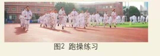 七、八年级以班级为单位,1路纵队在足球场进行50m×8往返跑;九年级4 路纵队在400m环形跑道上完成800m 匀速跑。伴着铿锵有力的音乐,学生们队列整齐、保持匀速、精神饱满、气势雄壮,看似简单的跑操练习,体现了师生们积极向上的精神面貌(图2)