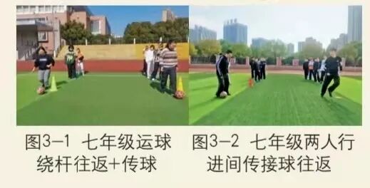 七年级的主题是以球健体。以校园足球组合练习为主,每班分成4组, 以小组为单位开展各项练习:运球绕杆往返+传球、两人行进间传接球往返、2对1攻防练习。要求所有学生观察场地情况、准确判断、及时反应、快速跑动(图3)