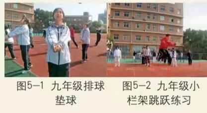 九年级的主题是冲刺中考。主要围绕中考体育项目,设置4个相关内容,两个班级为单位每天进行项目轮换练习, 一周为一轮次。1.选考项目:排球垫球、篮球绕杆运球、足球绕杆运球。2.绳梯步频练习:小步跑、高抬腿、侧向跑。3.小栏架跳跃练习:收腹跳、连续跳远、单脚跳。4.上肢、核心力量练习:俯卧撑、仰卧起坐、卷腹。要求所有学生布置场地迅速、动作练习到位(图5)