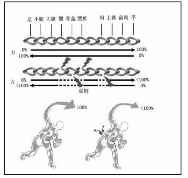 从生物力学的角度看,弱链(weak link)是指生物力学链上的薄弱环节,肢体的运动可以看作由一个个关节构成的运动链上的传递。在一个动作中,某肌肉(通常是局部稳定肌)和其他肌肉一起工作时,它太弱以至于不能发挥它应有的那部分作用,这样力的传递就会受到干扰,这就是运动过程中的弱链。如果运动链上的各环节或某一环节的内部出现肌力不足、疲劳、损伤等相对薄弱状态时,便会引发运动弱链现象,如下图。弱链可以造成神经-肌肉控制能力的降低,稳定性和肌肉力量下降,从而导致骨骼肌系统的功能下降,及相应的神经、骨骼肌痛。