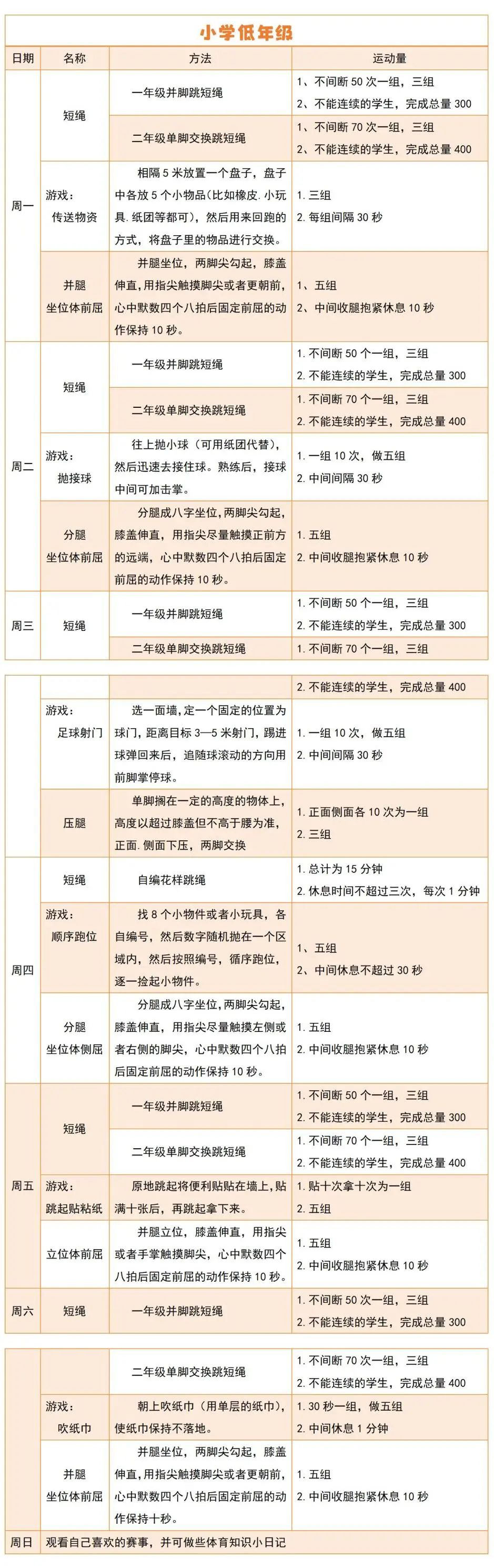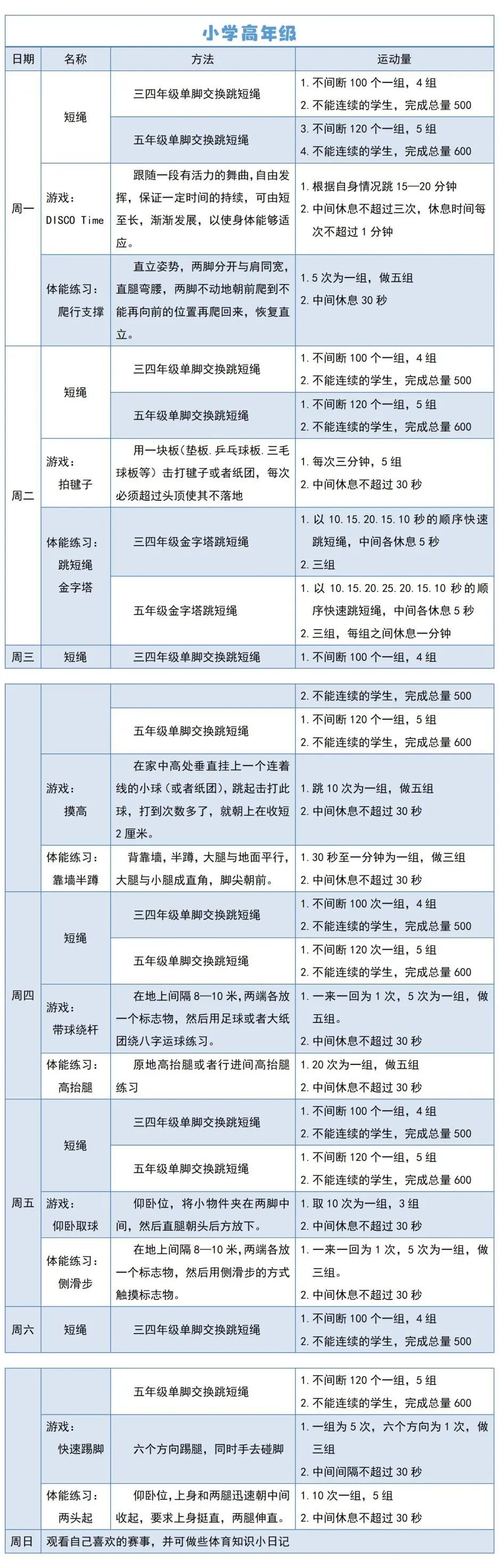 最近因为疫情,好多同学又开始了居家学习。这里给大家准备了一份居家锻炼指南。高年级加了力量和耐力,低年级着重在灵敏、速度和柔韧上,同学们可以根据自身实际情况选择合适的体育项目进行锻炼。