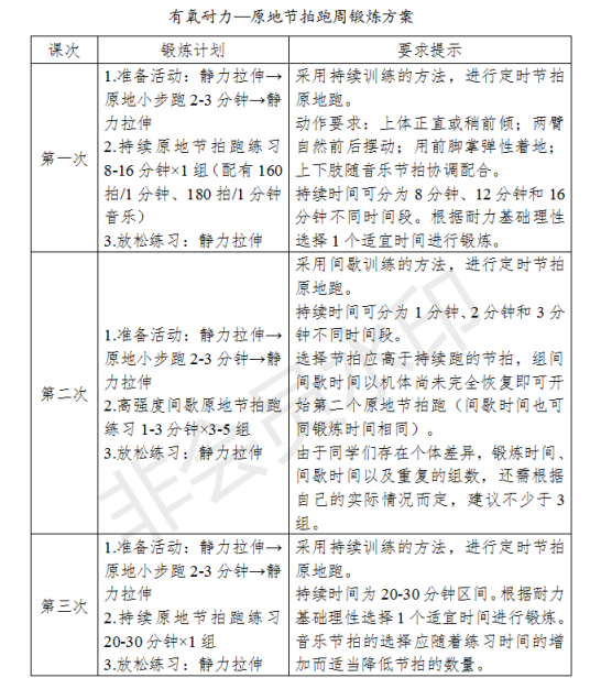 原地节拍跑主要锻炼目的是培养同学们长距离跑时的节奏感。可采用每分钟150—180拍的音乐(本锻炼计划提供了160拍/1分钟、180拍/1分钟音乐,也可根据自己的耐力基础水平选择适应的节拍,可网上自行下载),采用不同时间段定时原地节拍跑,提高耐力素质的同时有效建立良好跑节奏的锻炼方法。