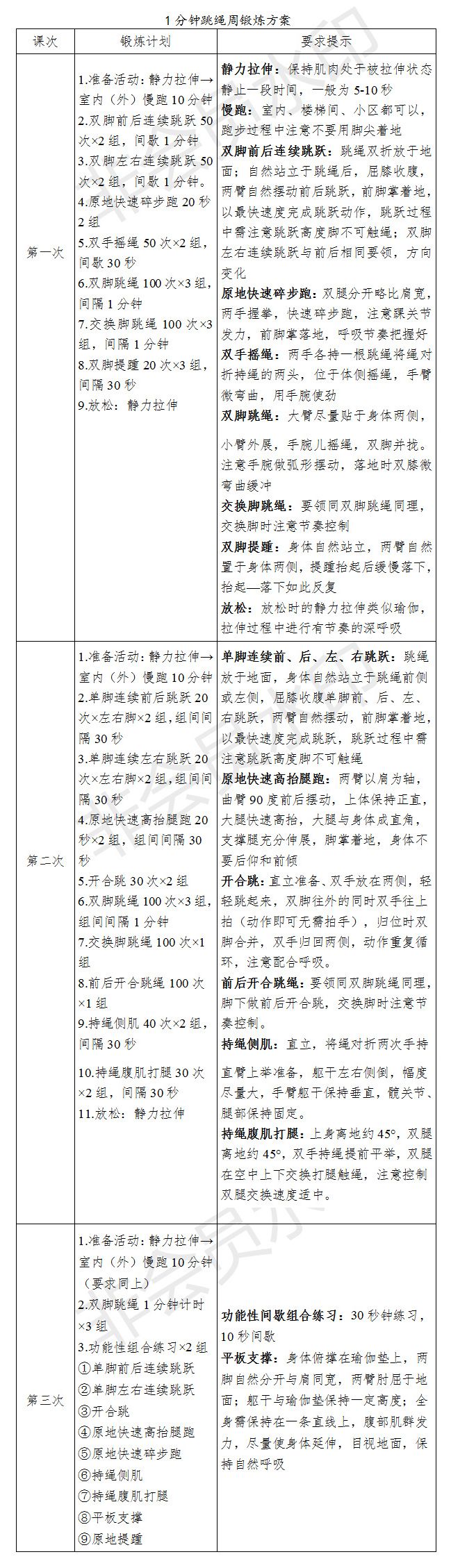 居家通过有计划的有氧运动也可改善你的心肺功能水平,保持和提高耐力素质。跳绳项目对于居家是较容易开展的运动。跳绳运动一方面能帮助我们维持良好的身体姿势、建立腿部肌力、增加敏捷弹性;另一方面通过采用间歇训练的方法,靠着动、停、动、停的运动模式,产生过量氧耗效应,帮助我们增强心肺功能提高耐力素质。