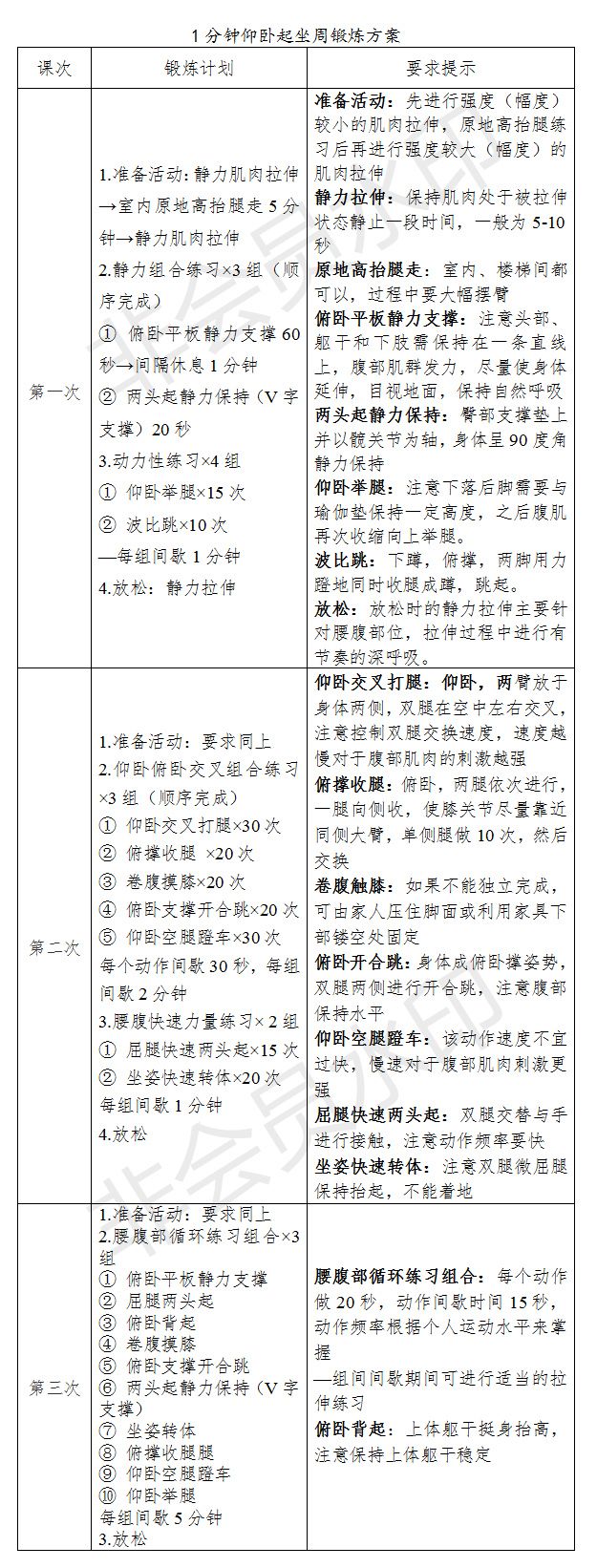 此套方案锻炼时间每周3次,隔天进行练习,在开始锻炼的首周要注意运动强度,遵循逐渐增加训练量的原则。
