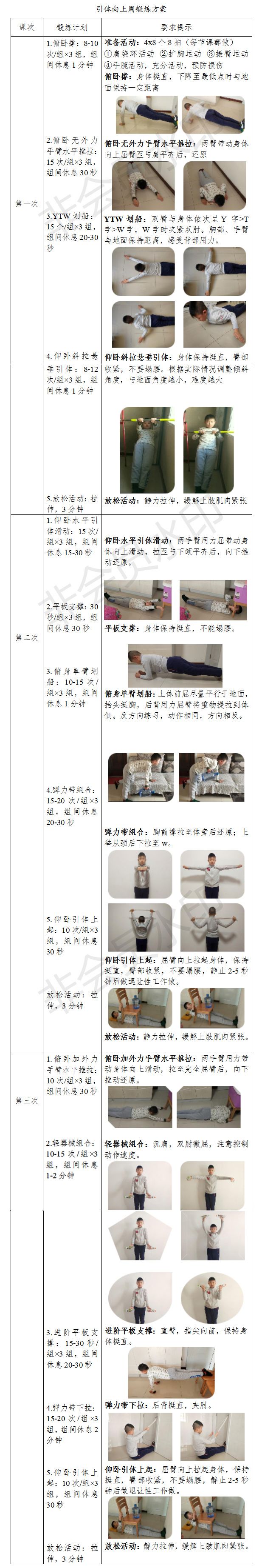 引体向上,主要考察上肢肌肉力量的发展水平。此套方案锻炼时间每周3次,隔天进行练习,在开始锻炼的首周要注意运动强度,遵循逐渐增加训练量的原则。