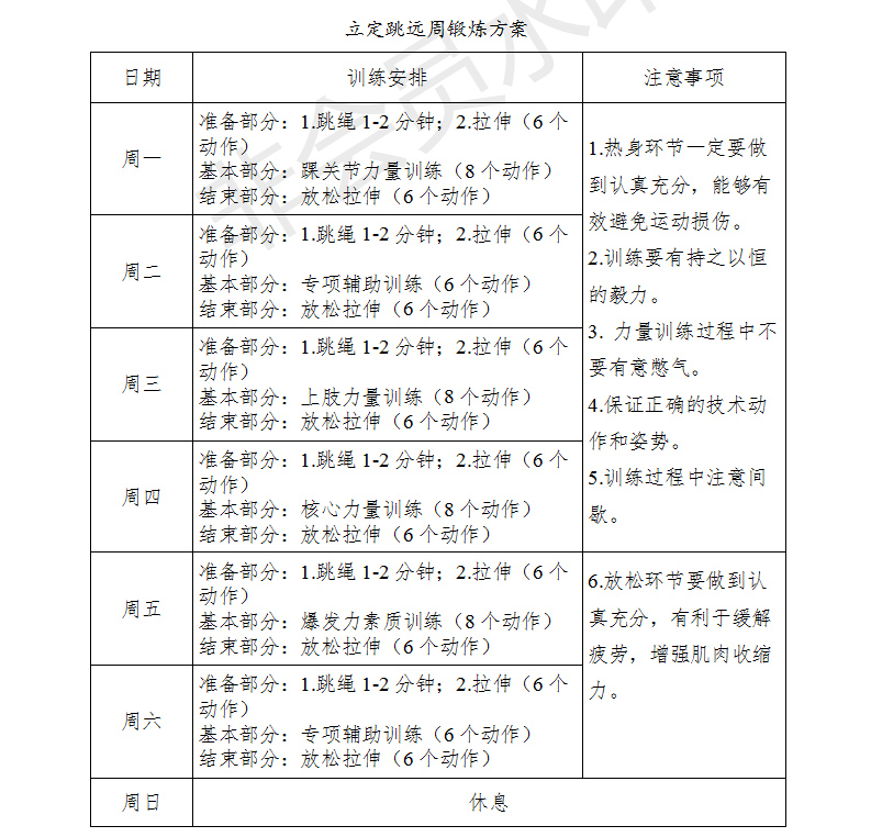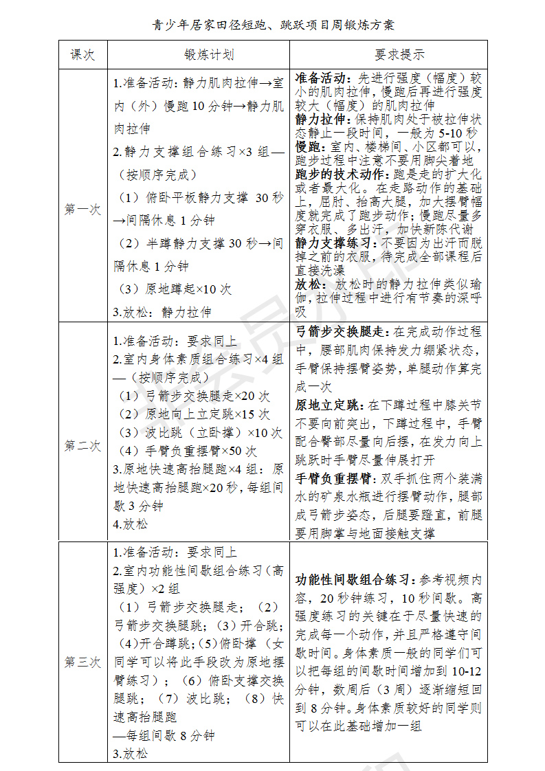 这套周训练计划方案,针对于田径运动的短跑和跳跃项目的体能与技能可以起到非常好的帮辅作用,特别是对即将参加体育中考的同学们,居家学习期间,既可以保持良好的身体状态,还可提高心肺有氧能力和身体素质,更重要的是让同学们的身体更加健康。